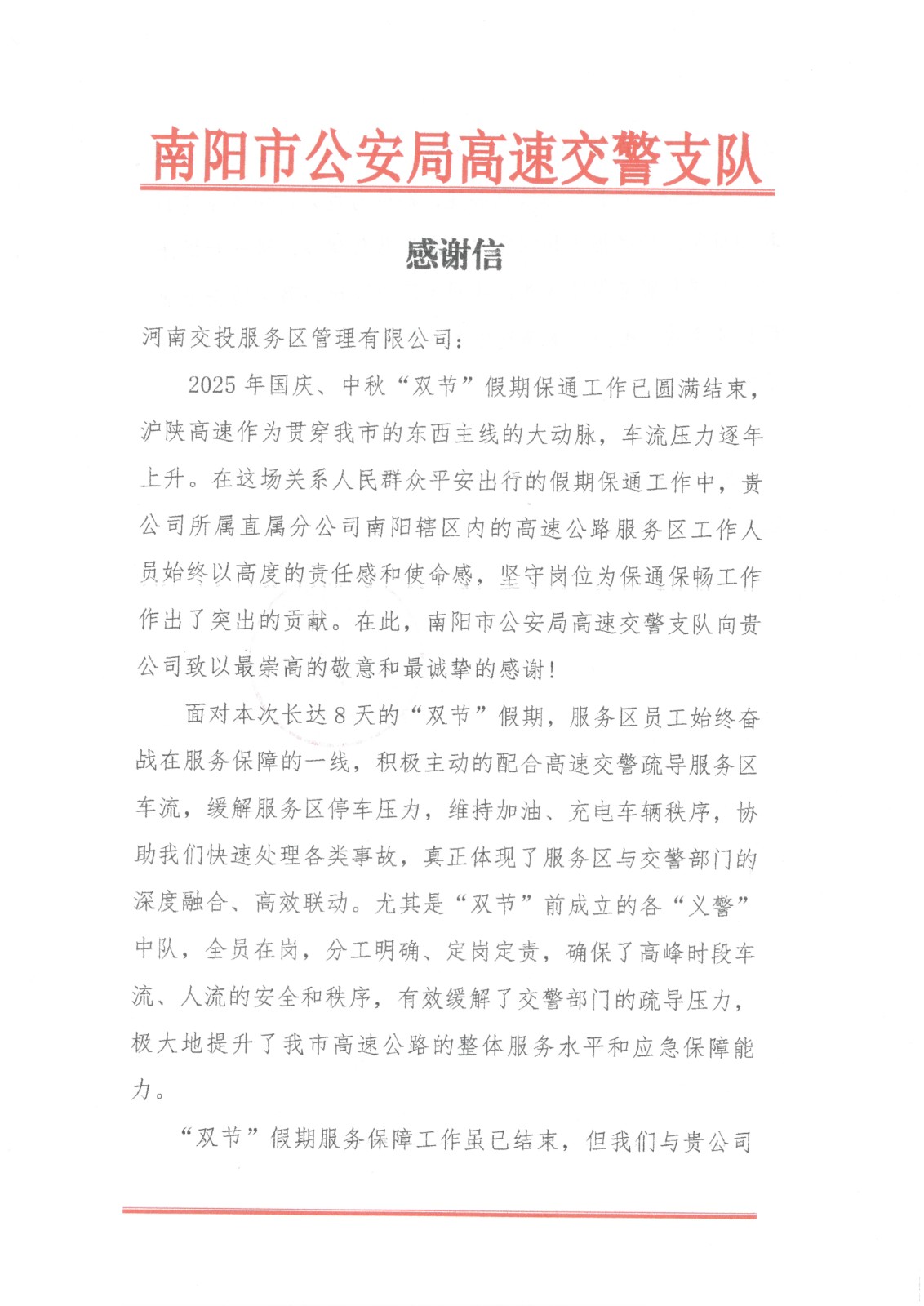 《一封感謝信 濃濃服務…》 10月10日,南陽市公安局高速交警支隊向公司所屬直屬分公司寄來感謝信,表達對南陽轄區(qū)內…